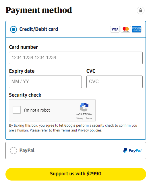 使用VISA/MASTER CARD或Paypal的付款的UI简介(方案开发中,截图来自The Guardian):